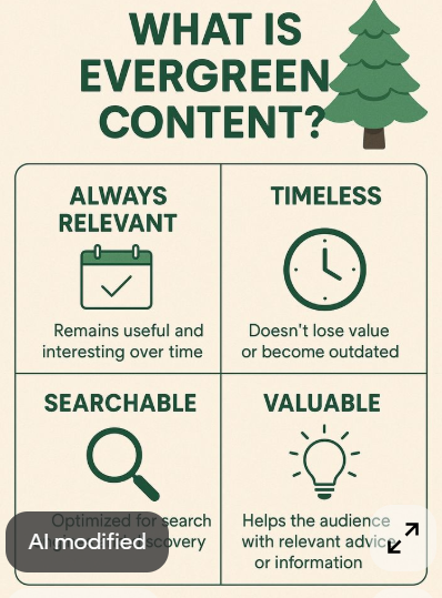 Evergreen content is content that remains relevant, useful, and searchable over time, regardless of trends or dates.