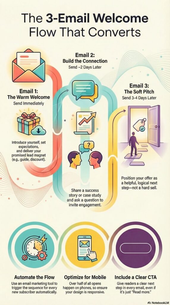 Email automation ensures consistent delivery of your welcome sequence.